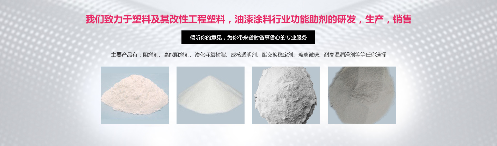 公司全心致力于以下幾個領域:阻燃劑在工程改性塑料的運用,鹵素及其無鹵 ;改性工程塑料在剛性,表面光潔度,耐溫度及其特殊要求方面的改進方案; 聚氨酯彈性體類的阻燃方案;油漆涂料阻燃及其他功能方面的建設性方案。